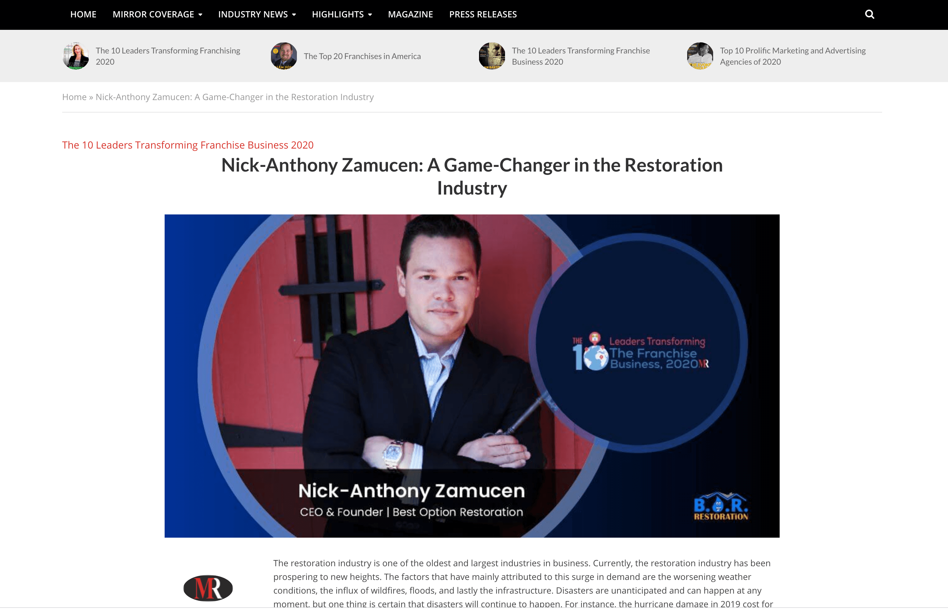 Mirror Review published the article "Nick-Anthony Zamucen - A Game-Changer in the Restoration Industry" and we couldn't be prouder! Over the past 15 years, Nick has established a Pizzeria Chain franchise, a home care franchise, a bio-recovery franchise, and BOR. All of which are stories of success!