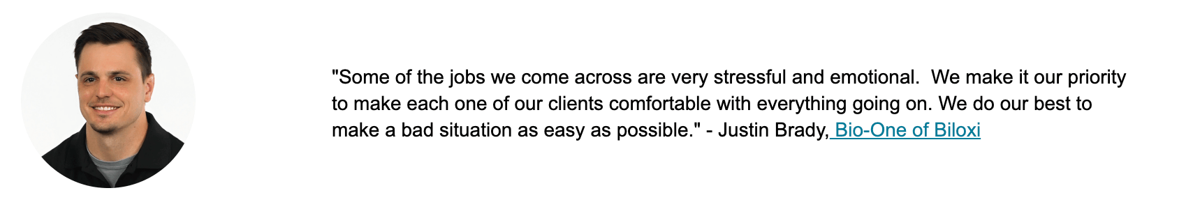 This is a core mentality of the Bio-One motto Help First, Business Second. Crime scene cleaning is an industry where you know you are making a positive difference in people’s lives, and you will have the opportunity to help people in their greatest time of need. It's as close to being a hero on a day-to-day basis as you can get.